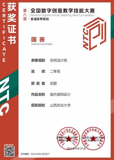 9月28日,第八届全国数字创意教学技能大赛(NCDCTS)总决赛在长沙理工大学圆满收官。山西农业大学园艺学院艺术设计系武丽副教授凭借省一流课程、课程思政示范课程《室内装饰设计》的精彩展示,从全国304所高校695个课程团队中脱颖而出,荣获空间设计组全国二等奖。